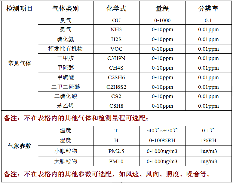 任选氨气、三甲胺、硫化氢、甲硫醇、甲硫醚、二甲二硫、二硫化碳、苯乙烯、臭气OU值在内的1-9个指标,目标气体可进行任意组合、检测原理不限、检测浓度范围不限,同时支持选配其他气体和PM2.5、PM10、温湿度、风速风向、大气压、噪音、照度等气象参数监测。